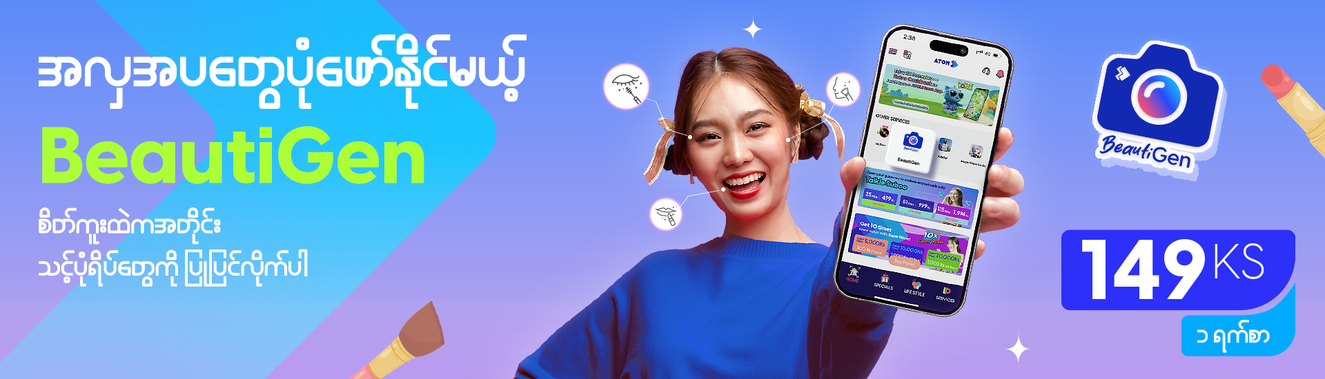 BeautiGen ၀န်ဆောင်မှုမှ ဓာတ်ပုံလှလှတွေ ဖန်တီးရင်းနဲ့ လျှပ်စစ်စက်ဘီး၊ ရွှေလက်စွပ်၊ ငွေသားဆုနဲ့ ဖုန်းဘေလ်များကို ကံထူးခွင့်ရှိနေပါပြီ။ ပုံလှလှလေးတွေဖန်တီးရင်း ဆုတွေကံထူးဖို့ အခုပဲ https://btgen.asia မှာ စာရင်းသွင်းလိုက်ပါ (သို့) *979*2*6# သို့ခေါ်ပါ။