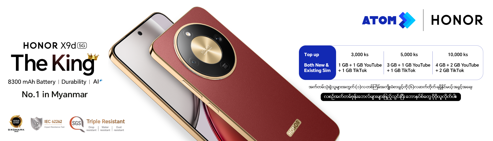 ATOM ၏ မိတ်ဖက်ကုမ္ပဏီများထံမှ ဖုန်းအသစ်တစ်လုံးဝယ်ယူတိုင်း အက်တမ်ကထပ်ဆောင်းပေးတဲ့ ကြိုက်နှစ်သက်ရာအသုံပြုနိုင်တဲ့ ဒေတာလက်ဆောင်တွေအပြင် Youtube နဲ့ TitTok သီးသန့်ကြည့်ဖို့ ‌‌‌‌‌ ဒေတာလက်ဆောင်တွေပါ၀င်တဲ့ အထူးအကျိုးခံစားခွင့်များရယူနိုင်ပါပြီ။